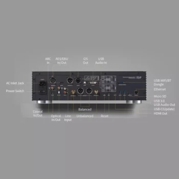 - Ljudutgångar: Optisk x 1, COAX x 1, Pre-OUT (Balanserad x 1, Obalanserad x 1), I2S-DVI x 1, I2S-RJ45 x 1, AES/EBU x 1